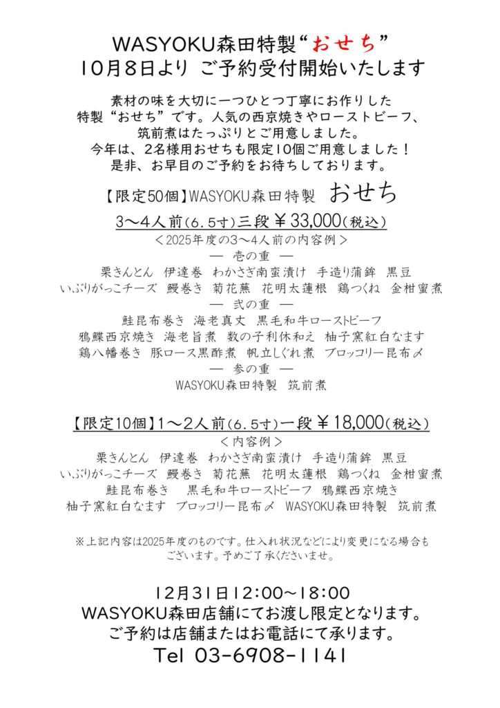 WASYOKU森田特製「おせち」ご予約開始のお知らせ