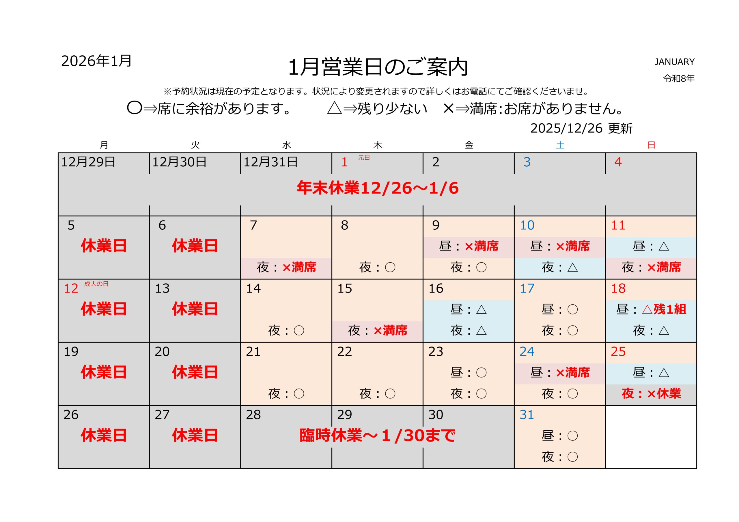 2025年12月28日 Information 1月営業カレンダーのご案内 いつもご愛顧いただきありがとうございます。 1月の営業カレンダーです。 2026年年末休業は12月26日(金)~1月6日(火)となります。 1月は28日(水)~30日(金)まで臨時休業とさせて頂きます。 電話でのお問い合わせは、1月7日(水)の17:30より承ります。 皆様のお越しを心よりお待ちしております。 WASYOKU森田