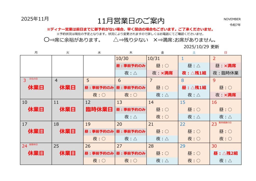 11月2日ディナー営業、12日水曜日は諸事情により臨時休業致します。何卒、ご了承くださいませ。
