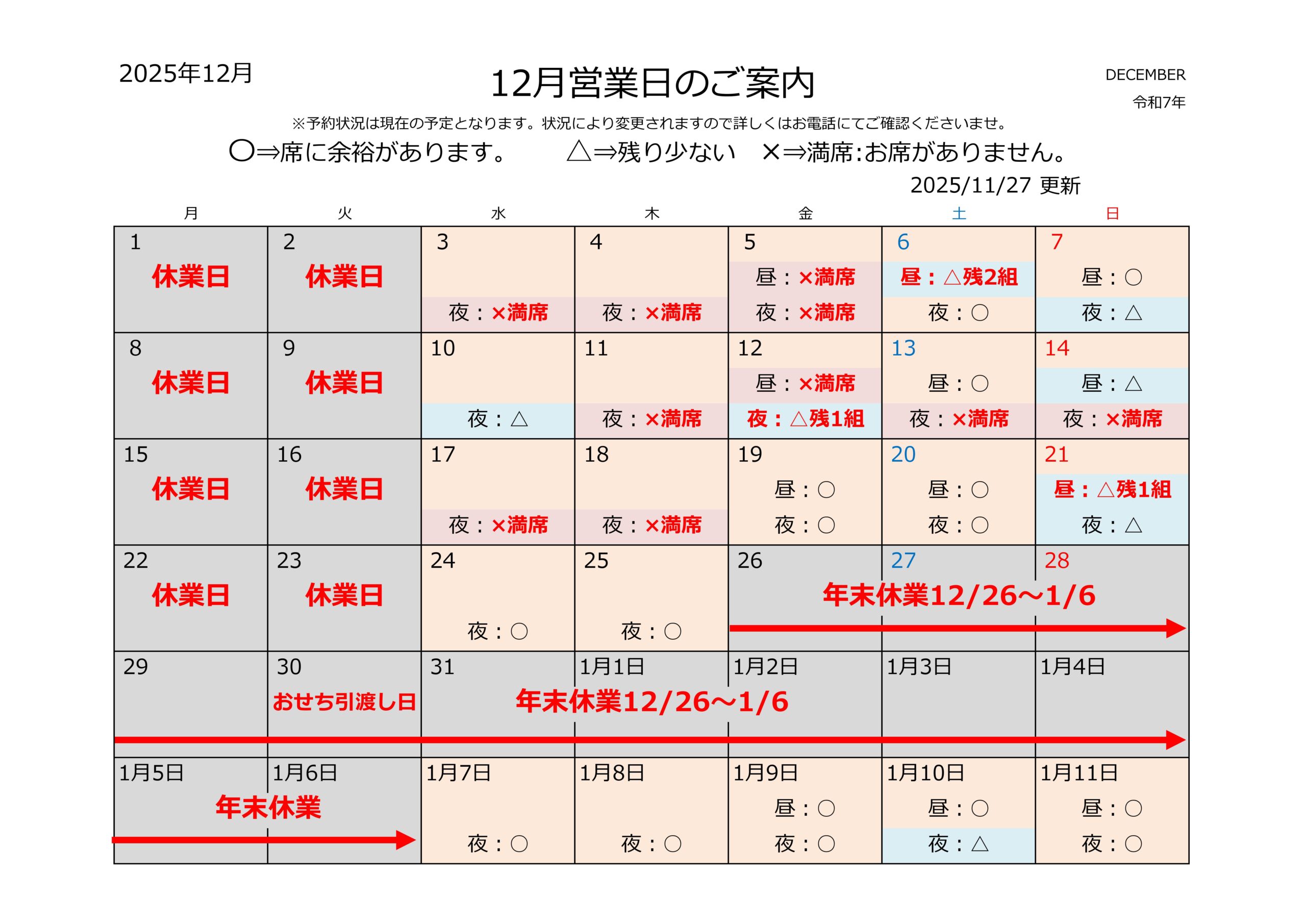 2025年11月27日 Information 12月営業カレンダーのご案内 いつもご愛顧いただきありがとうございます。 12月の営業カレンダーです。 忘年会シーズンの為、ディナー営業の満席日が多くなっております。 ご予約は是非、お早めにご連絡くださいませ。 最新の空き状況はお電話にてお問い合わせください。 年内の営業は12月25日が最終日となります。年始はディナー営業が1月7日、ランチは1月9日からスタートとなります。 皆様のお越しを心よりお待ちしております。 WASYOKU森田